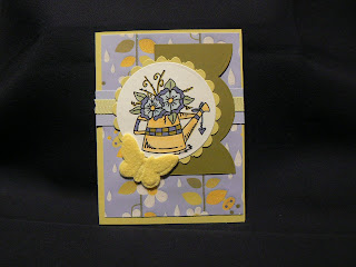 Back with some challenge cards! First is a card that I will be using in a swap on Splitcoast Stampers. It is a flower swap, hosted by Barbaralynn. I used the www.Bugaboostamps.com/ image called Flower Watercans--Violet. Thought this was a beautiful image! I used DP from my stash, papertrey cardstock and ribbon, a felt butterfly that I bought at CHA, and a sketch from SSDS (more about that later!) Here is my card: